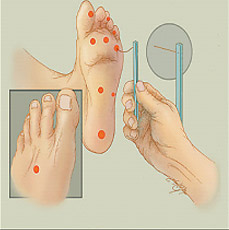 - Monofilament Test: Loss of feeling (touch sensation) in the feet, tested with the help of 10 gm monofilament (wire like instrument)